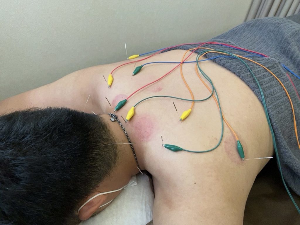 身体に刺した鍼に電気を通電する治療です。電気の力で動きの悪い筋肉を動かしたりする際に使います!