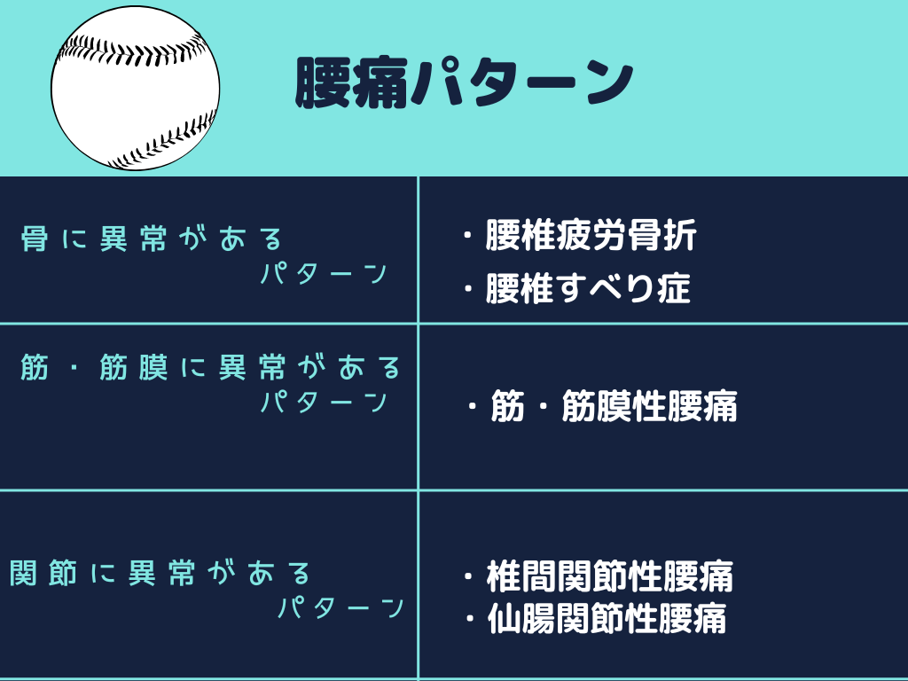 野球選手が起こしうる腰痛には以下の3つの視点で原因を考えることができます。